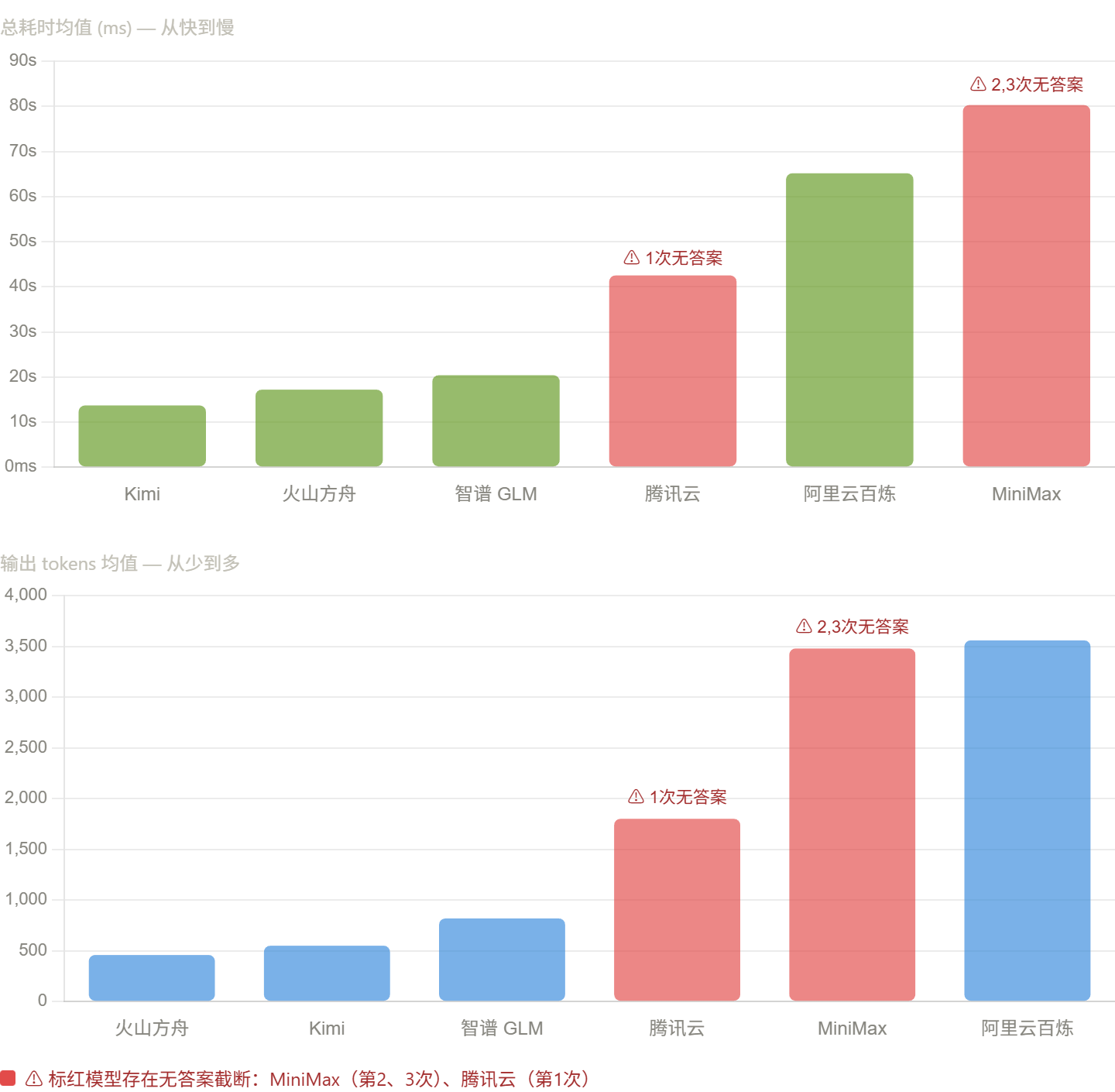 从图表中可以非常直观的看到,基于我的网络环境和测试问题来看,速度前三是:Kimi,智谱,MiniMax