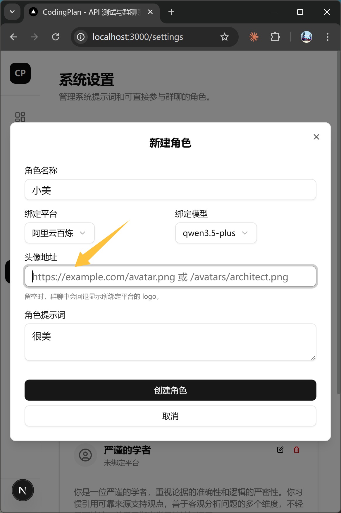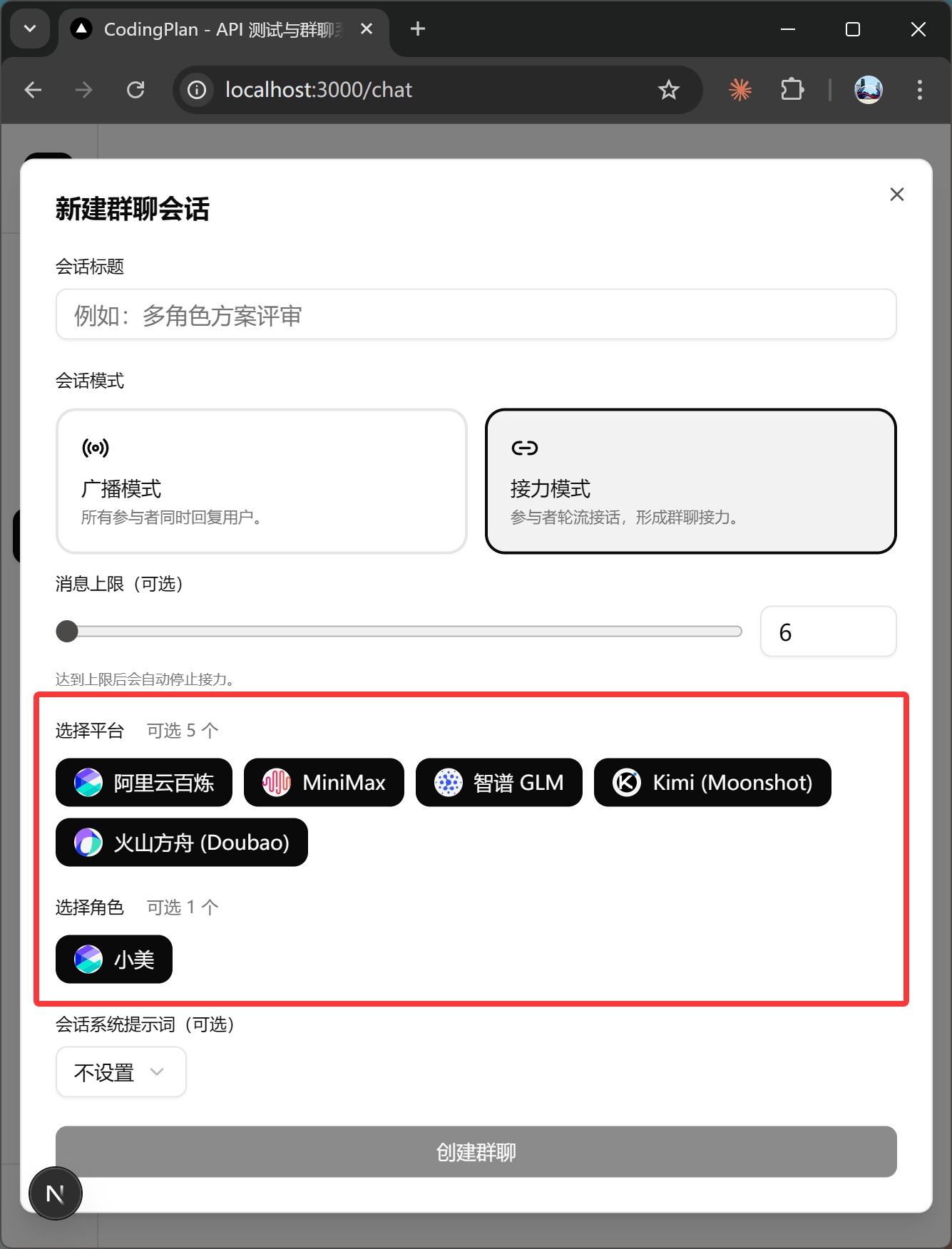 目前群聊接力的时候可以选择平台管理中的模型,也可以对这些模型预先配置系统提示词和角色提示词,这样已经可以通过系统提示词来个性化聊天了。但是通过平台配置里面绑定角色比较有局限性——这样一个平台就只能是一个角色。