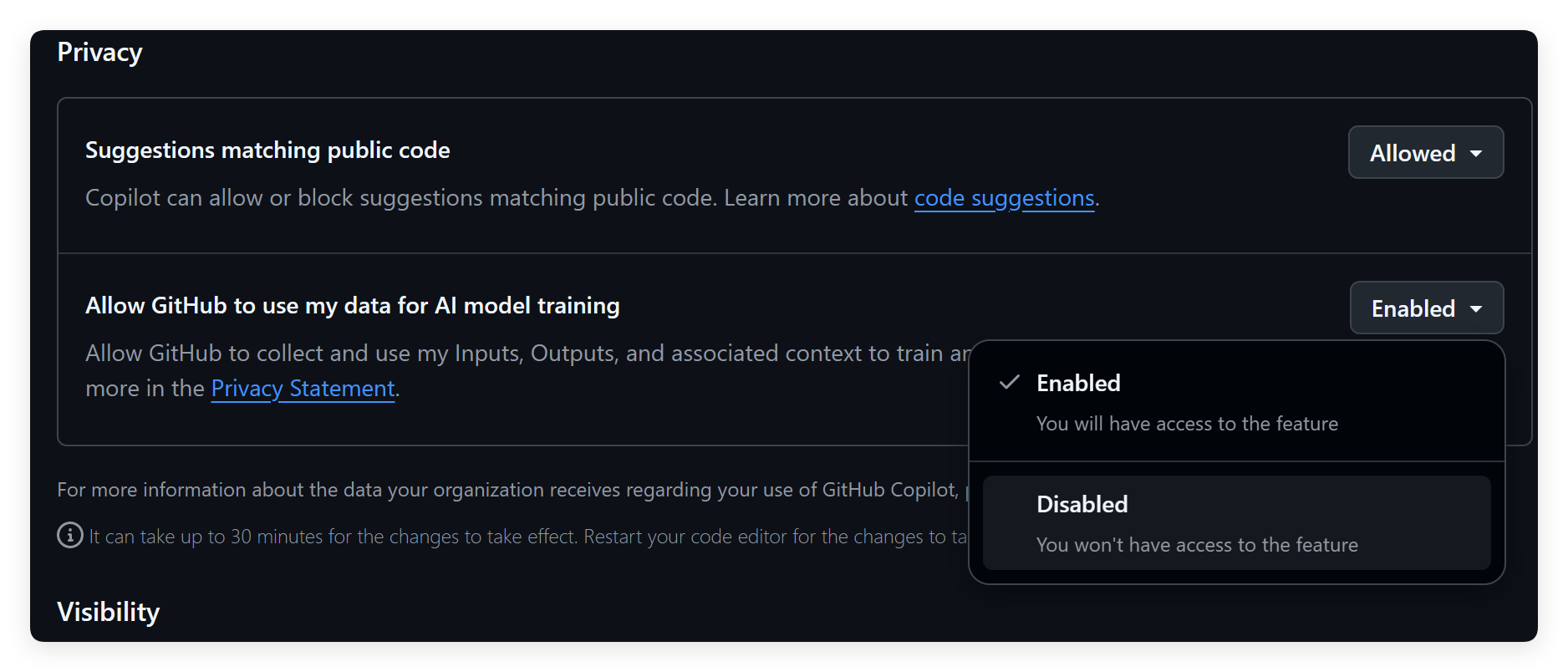 然后找到Allow GitHub to use my data for AI model training。