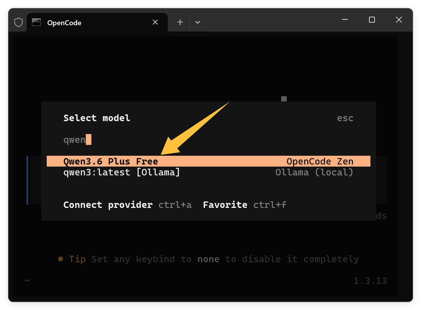 然后通过 Switch model 选择 Qwen3.6 Plus 模型。