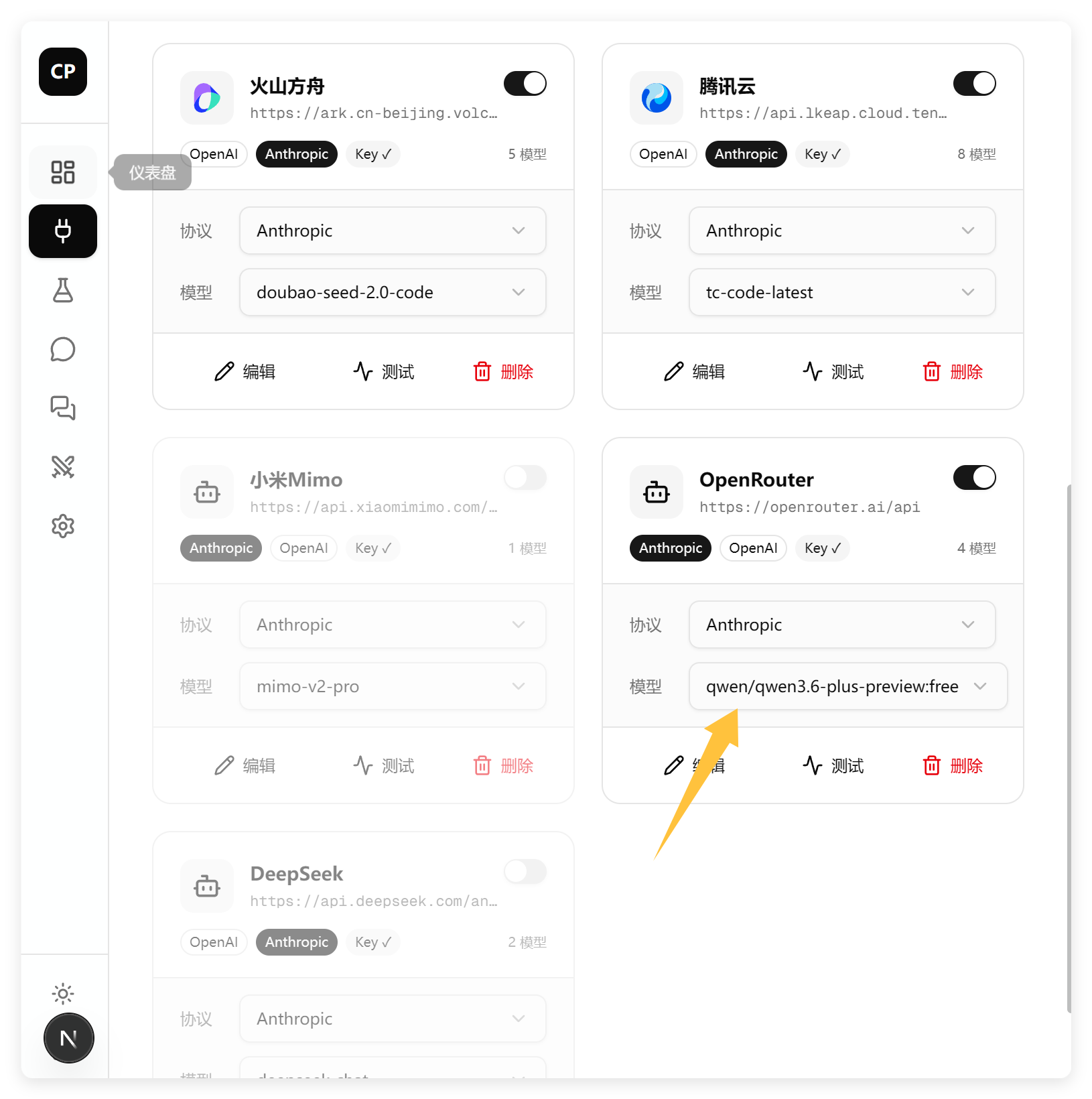 CodingPlan 是我自己开发的,专门用来批量测试不同平台的 CodingPlan 计划。可以轻松地把 OpenRouter 的 API 添加到里面。