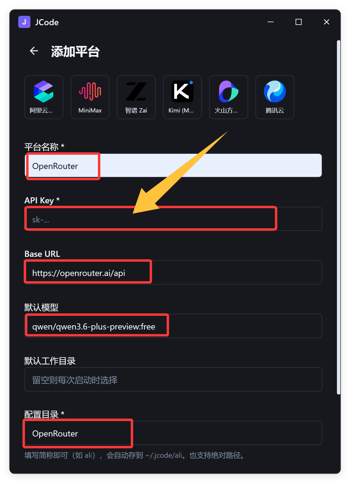 只要把 OpenRouter 的 API Key 放里面,其他照抄就可以了。