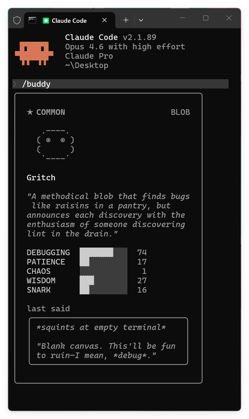 我这个电子宠物叫 Gritch,看长相是个什么物种呢?我好像也看不出来!从属性来看,我这个宠物的核心能力是 DEBUGGING。
