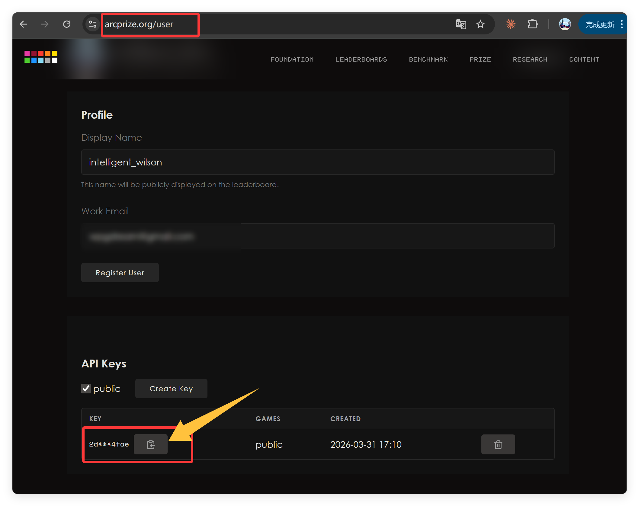 可选择设置您的 ARC_API_KEY。如果未提供密钥,将使用匿名密钥。不过,注册 API 密钥将使您在发布时能够访问公共游戏。获取 ARC_API_KEY