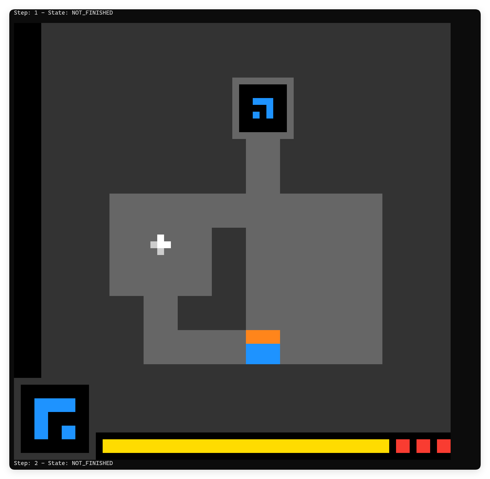env = arc.make("ls20"),无需任何render_mode操作,即可达到 2000 FPS 以上 - 尝试其他游戏 – 运行程序即可玩其他游戏。请访问 arcprize.org/tasks或通过 ARC-AGI 工具包中的