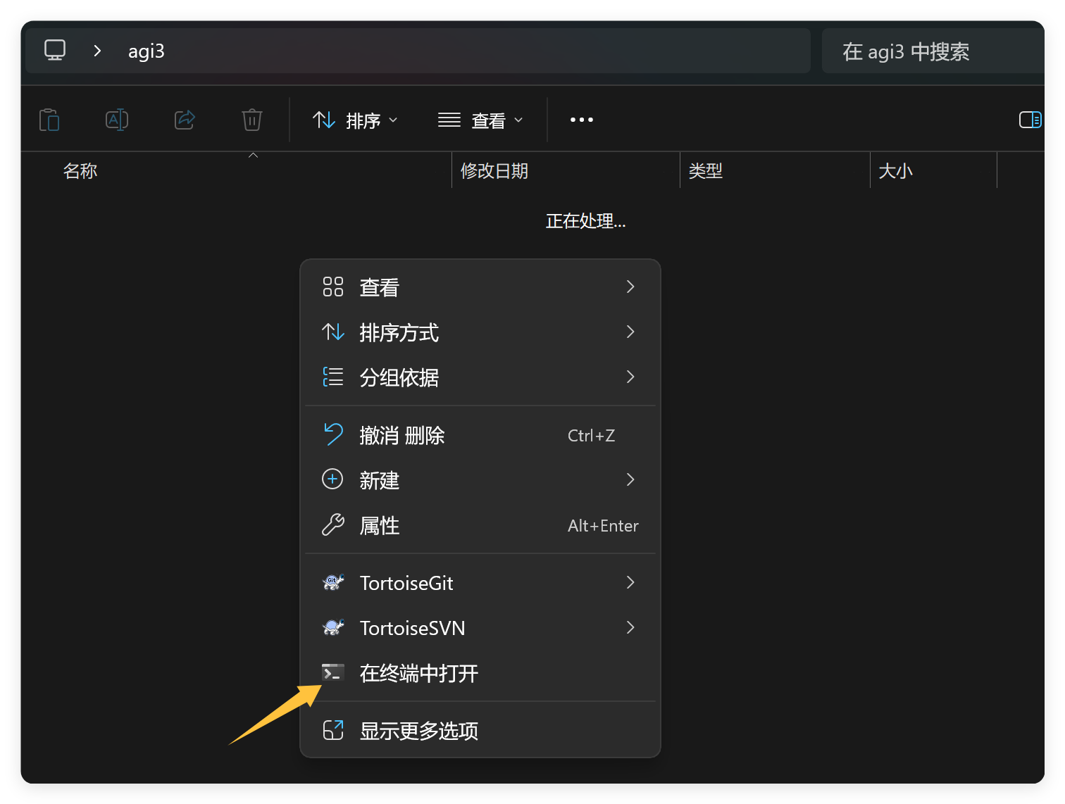 打开 agi3 这个文件夹,然后右键,在终端中打开。